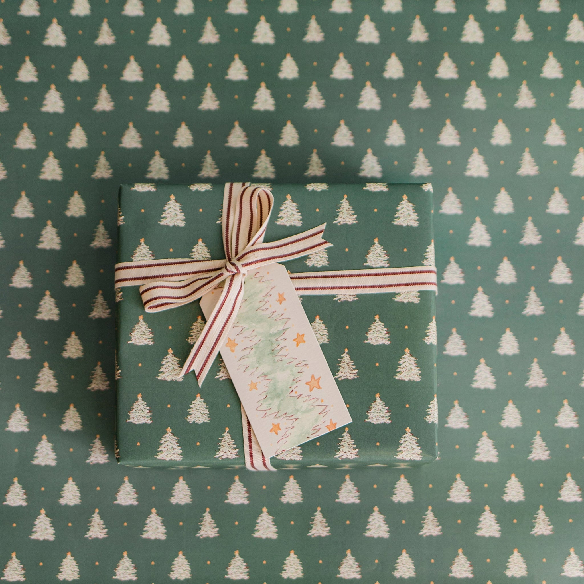 This charming cotton ribbon features two stripes of light green on a natural background.