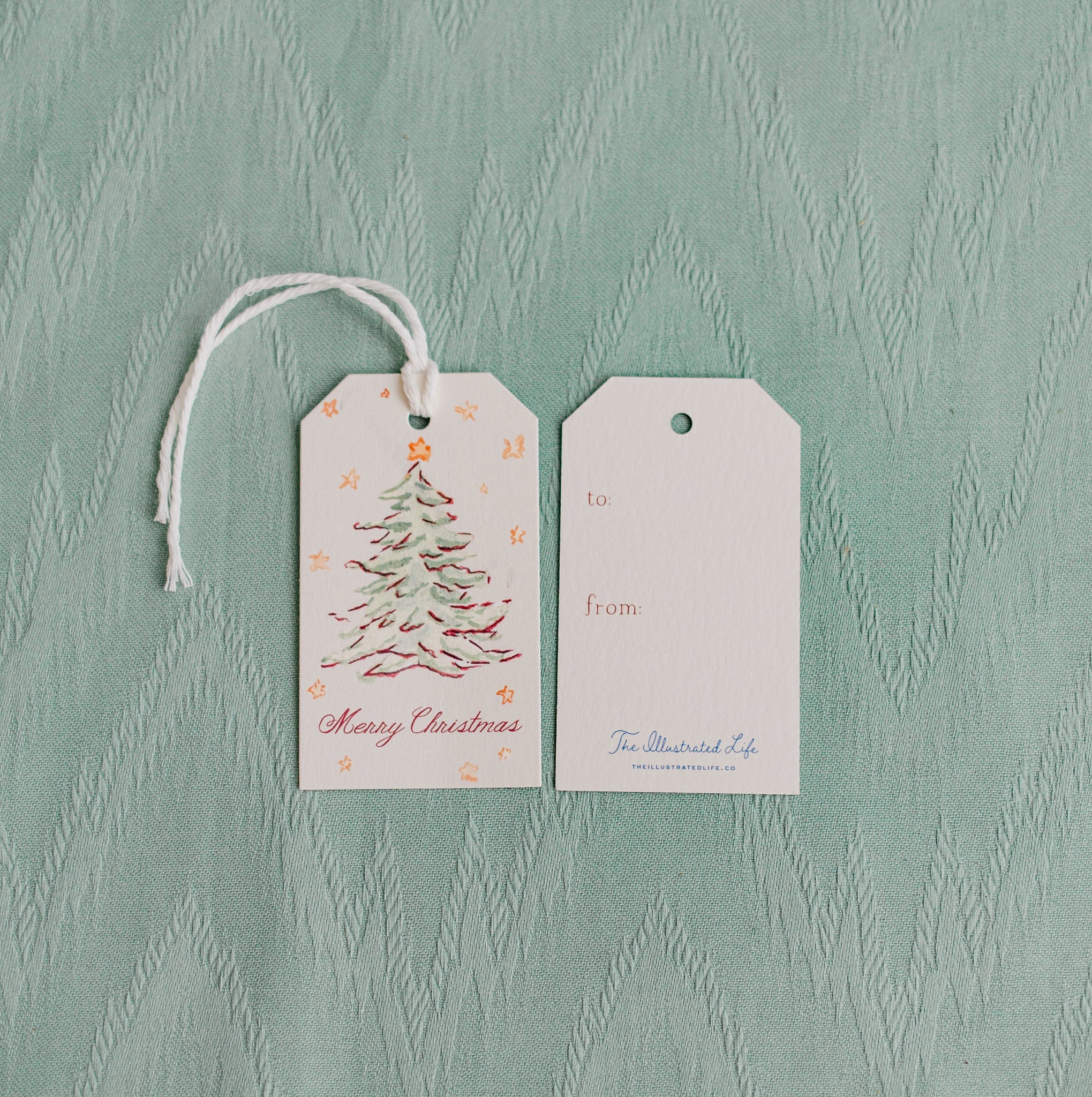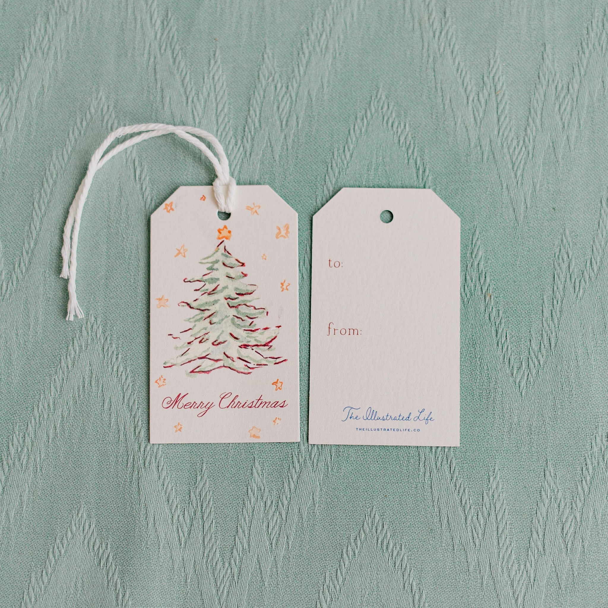 Set of 12 - 2x3.5 inch festive gift tags with string, featuring a cheerful Christmas tree with a scattering of stars. Pairs perfectly with our Christmas 2025 etoile gift wrap collection.